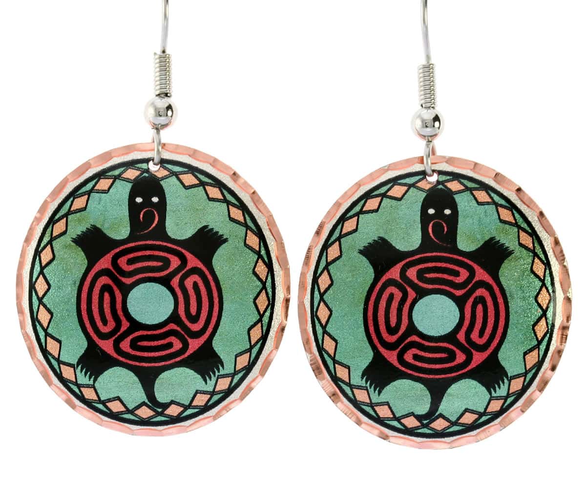 Colorful SW Native turtle earrings are made from copper in burgundy and patina-green colors. Buy premium quality Native turtle earrings for women who love to buy affordable, stylish, and quality jewelry. These pretty oval-shaped earrings are 26 mm X 28 mm ( about 1 inch) in size. Our handmade jewelry has 3-4 coats of acrylic finish. When not wearing they should be kept in their plastic bags so they do not get scratched. With proper care, you will enjoy them for many years. Express your story with each handmade piece of jewelry you put on. Our copper jewelry is handmade individually to capture the unique look that Southwest Native America has.