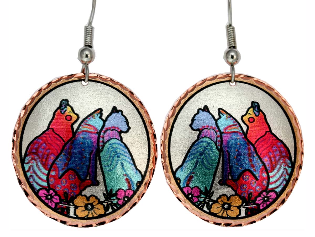 Unique earrings created in three cats designs offered by Copper Reflections artisans from original artwork by famous American artist, Jo Lynch.