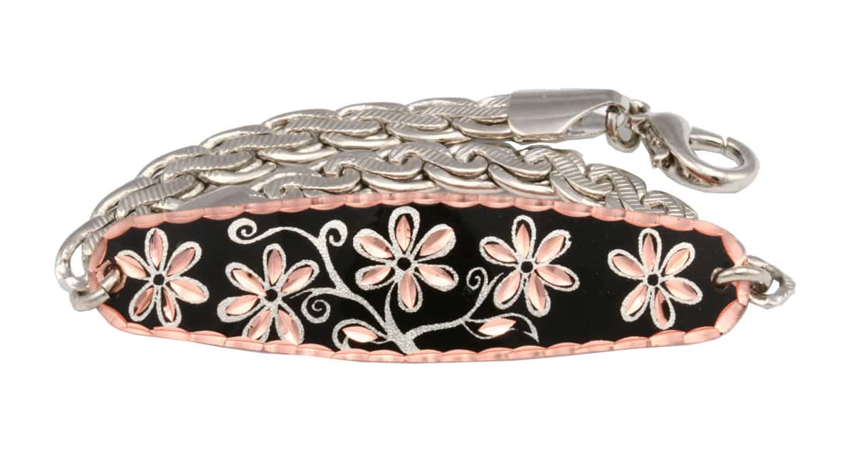 Chain bracelets with flower jewelry design are individually handcrafted, silver plated and diamond cut on copper. Each piece of our handmade jewelry has an acrylic coating to prevent tarnishing, so no polishing or special care is required.