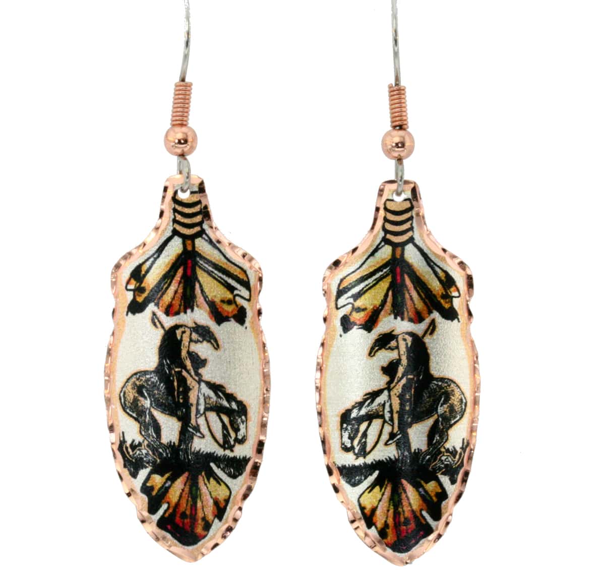 nd of the trail copper feather earrings are created in colorful end of the trail artwork on copper cut into a feather shape. Buy these end of the trail earrings to complement any western clothing. These precious feather shape copper earrings are 17.5 mm X 38 mm ( about 0.7 x 1.5 inches ) in size.