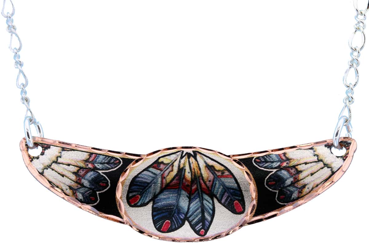 Copper feather choker necklaces made by hand by Copper Reflections skilled artisans and designed by Lynn Bean in beautifully appealing and eye-catching colors. Click the Add to Cart Button to purchase this gorgeous handmade choker in colorful feather artwork Now! Chokers are available with a beautiful silver tone chain 20 inches long. Perfect handmade jewelry chokers created in amazing colorful feather design to add shine and sparkle to your style because you deserve it.