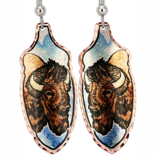 Handcrafted copper feather earrings are silver plated and diamond cut with colorful American buffalo artwork by Lynn Bean. The Buffalo or Bison represents the sacredness of life, great strength, abundance and gratitude.