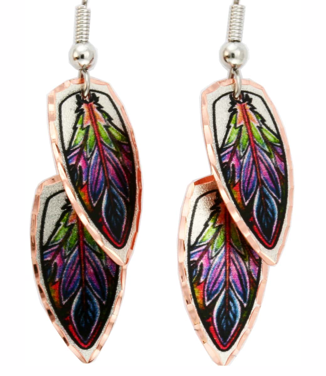 These green and purple feather artwork earrings are overlapping to create fun and fabulous unique earrings. Approximate length of these double feather dangle earrings is 3/4 inch.