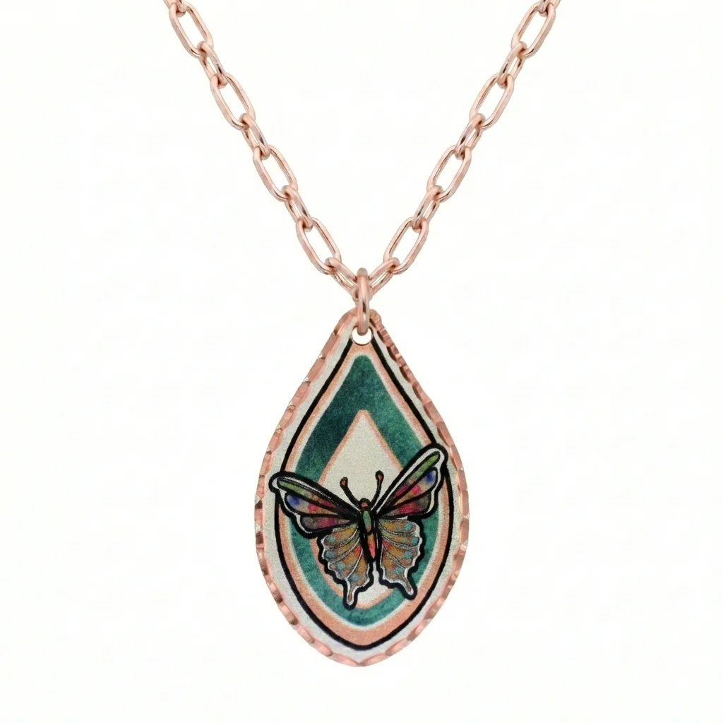 Let your style take flight with our handcrafted Copper Longtail Butterfly Necklace. Artisan-crafted from copper, silver-plated, and featuring beautiful translucent artwork, this stunning pendant is diamond-cut to sparkle brilliantly. It comes complete with a beautiful 20-inch copper-tone chain and is protected by a clear acrylic finish, meaning no polishing is ever required. High-quality, affordable, and elegantly versatile!