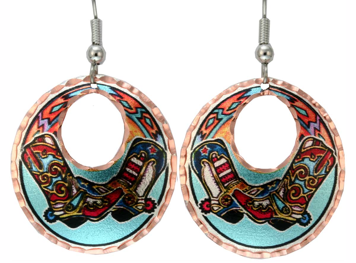 Colorful cowboy boots with western flair are handcrafted on these beautiful copper earrings.