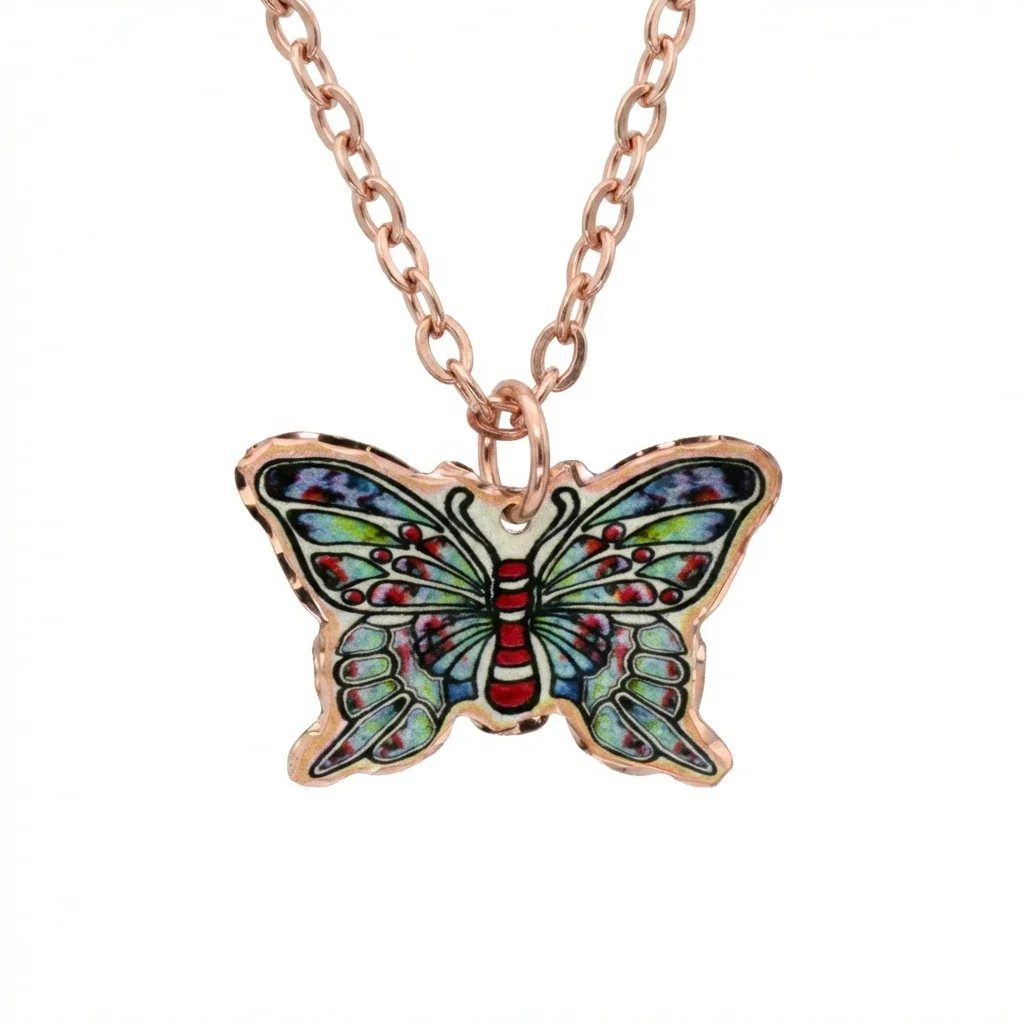 Handmade from copper and beautifully silver-plated, this pendant showcases a stunning cut-out butterfly design enhanced with translucent colors and vibrant artwork. Each piece is meticulously diamond-cut to catch the light and sparkle for a truly luxurious look. It arrives ready to wear on a beautiful 20-inch-long copper-tone chain. Best of all, no polishing is required—your pendant is protected by multiple layers of a durable acrylic finish, ensuring it stays pristine and radiant day after day.