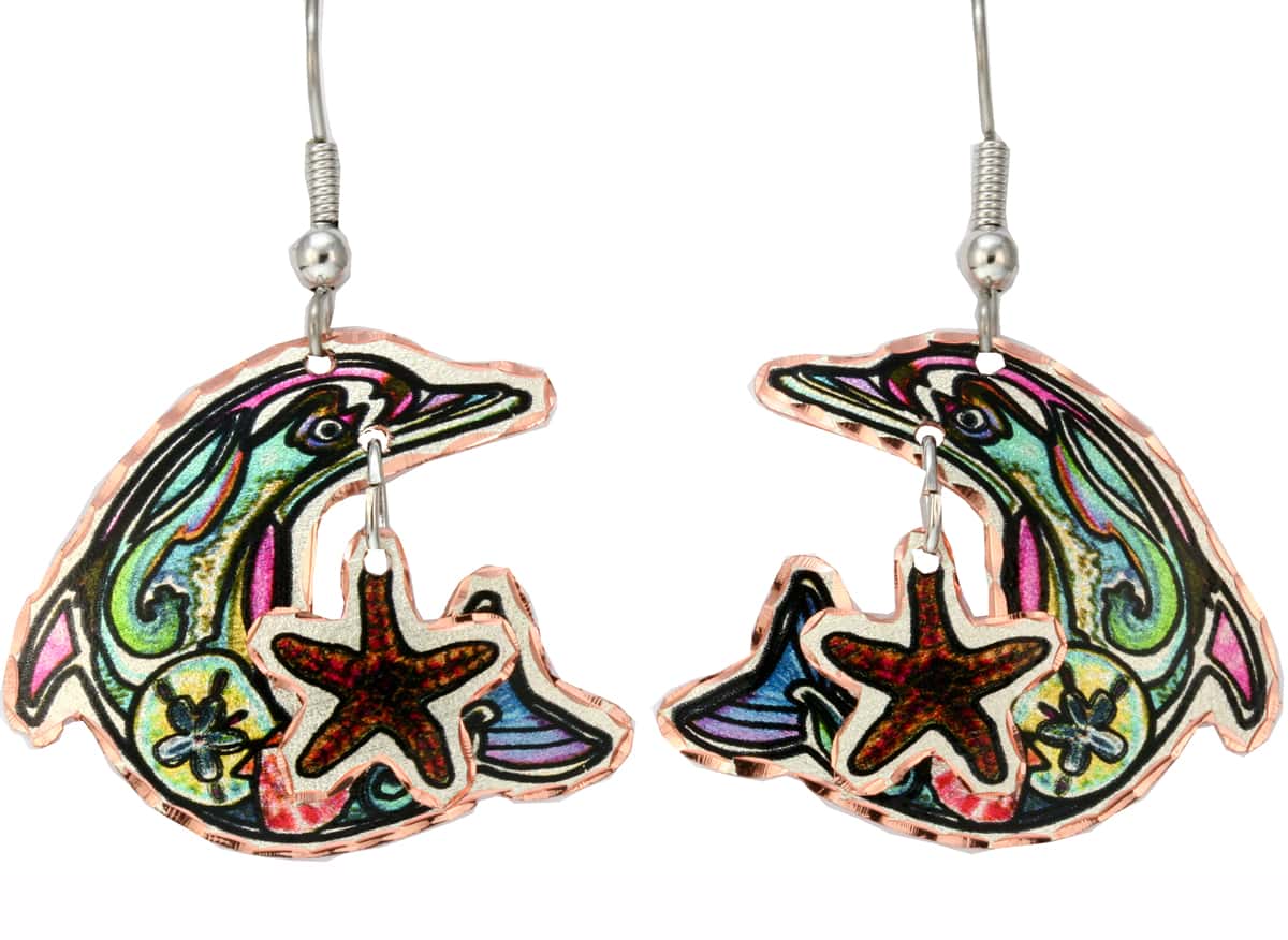 These fun and playful handcrafted earrings feature a cut out dolphin decorated with sand-dollar and shells with a dangle starfish. Individually silver plated and diamond cut on copper earrings these are perfect for fun in the sun.