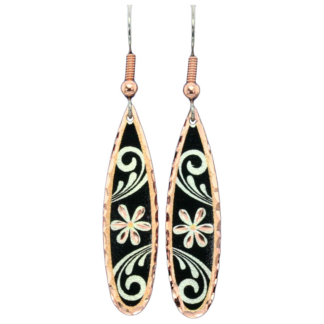 Dainty teardrop black flower earrings made from copper in silver-tone flower designs & black backgrounds. Buy outstanding flower earrings as they will impress all your friends every time you wear them. These attractive and fascinating slim teardrop shape copper earrings are 9.4 mm x 35 mm ( about 0.4 x 1.4 inches ) in size. Earrings are lightweight, ear wires are the best quality surgical steel hypoallergenic so you can comfortably and safely wear them for a long time even if you have sensitive skin.