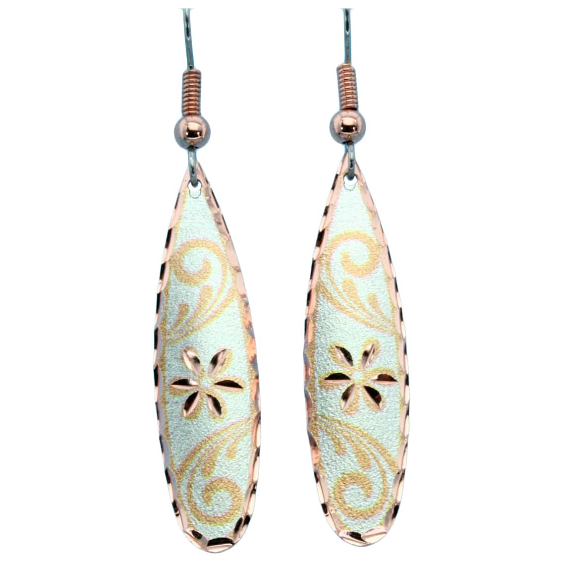 Dainty teardrop silver flower earrings made from silver-plated copper with diamond cut accents to sparkle. Buy silver flower earrings feminine and stylish. These attractive and fascinating slim teardrop shape copper earrings are 9.4 mm x 35 mm ( about 0.4 x 1.4 inches ) in size. Earrings are lightweight, ear wires are the best quality surgical steel hypoallergenic so you can comfortably and safely wear them for a long time even if you have sensitive skin.