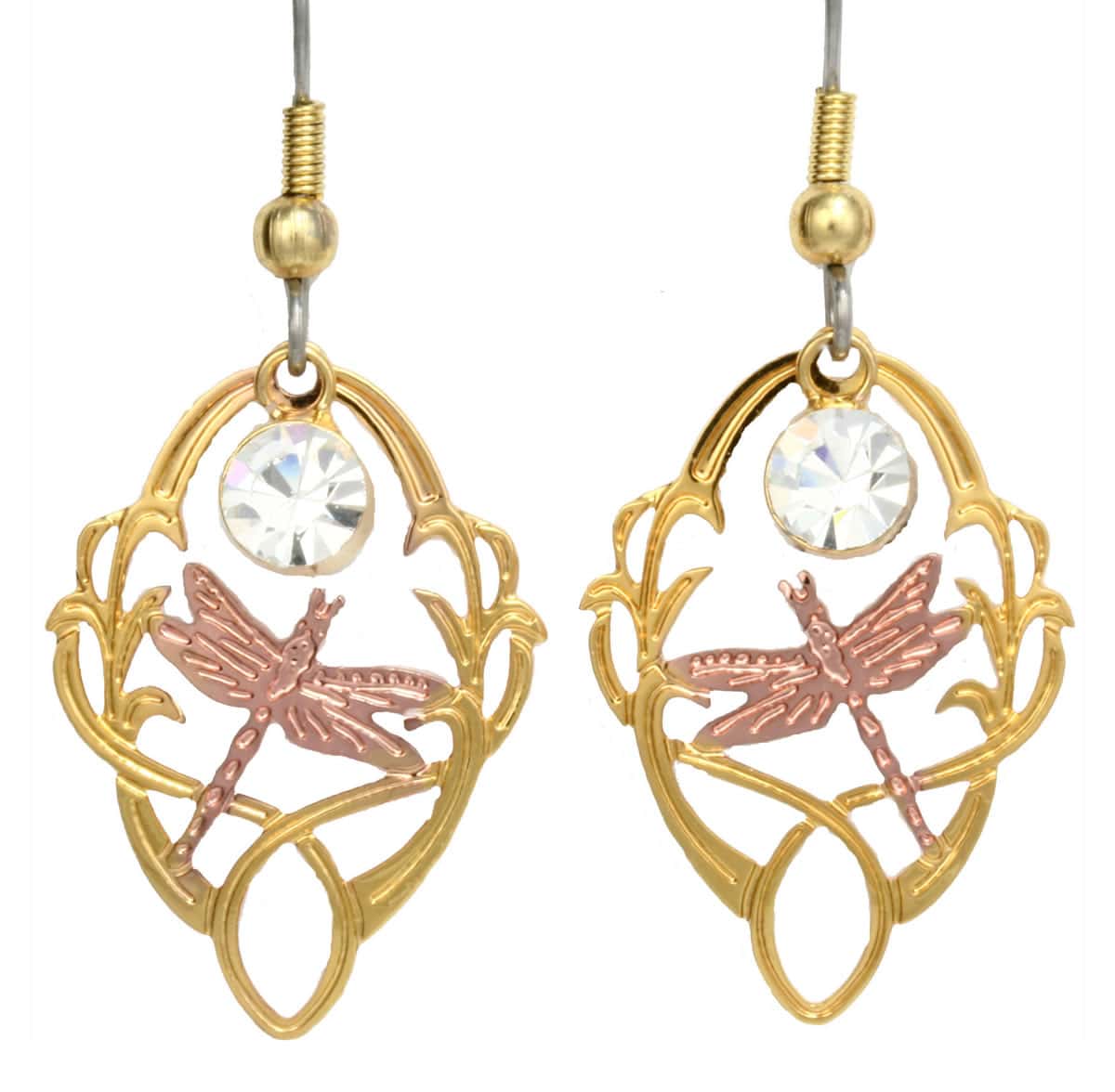 Dangle crystal dragonfly earrings are made from copper with golden accents and dangle crystal. Buy handcrafted dragonfly cut-out earrings with crystals that are so beautiful and you will not find them anywhere else. Earrings are lightweight, ear wires are the best quality surgical steel hypoallergenic so you can comfortably and safely wear them for a long time even if you have sensitive skin. No polishing is required as they are protected from tarnishing with many layers of acrylic finishes.