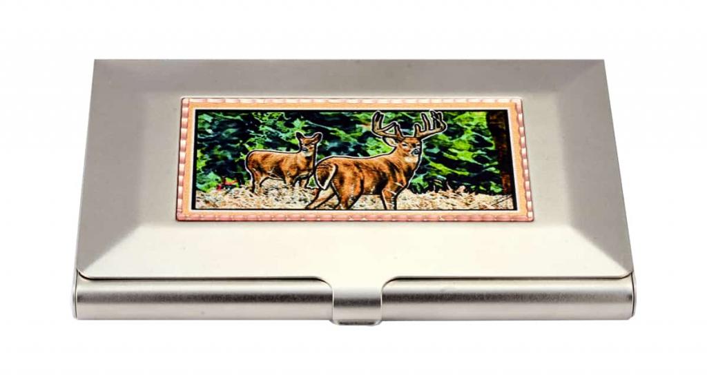 Deer business card holder is made in matt silver tone from metal decorated with exquisite copper deer & forest artwork. Buy handmade unusual copper gifts for him. Copper Reflections is the best online shop if you are looking for unique copper gifts for your husband or boyfriend. Silver-plated metal business card holders are 9.5 cm long and 5.5 cm wide ( 3.74 inches long x 2.17 inches wide ). They have a matte finish so they would not show fingerprints. Perfect choice for practical copper gifts for women and men to carry your business cards or credits card.