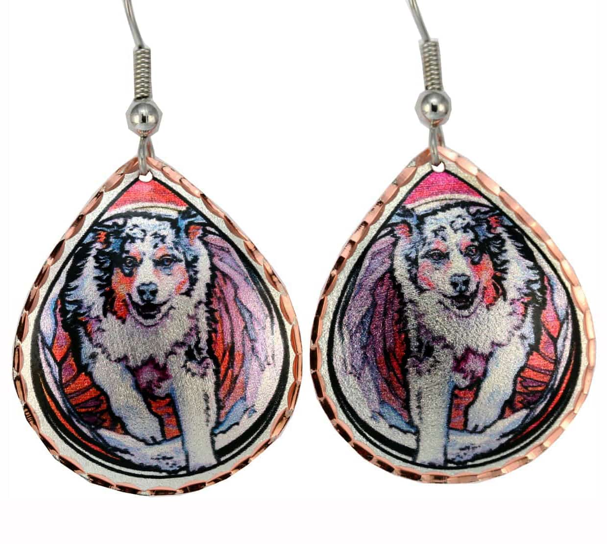 Handcrafted copper earrings are handmade, silver plated and diamond cut in this fabulous Australian Shepherd and agility tunnel artwork by Lynn Bean. These unique dog earrings will make a unique gift for Aussie dog lovers.