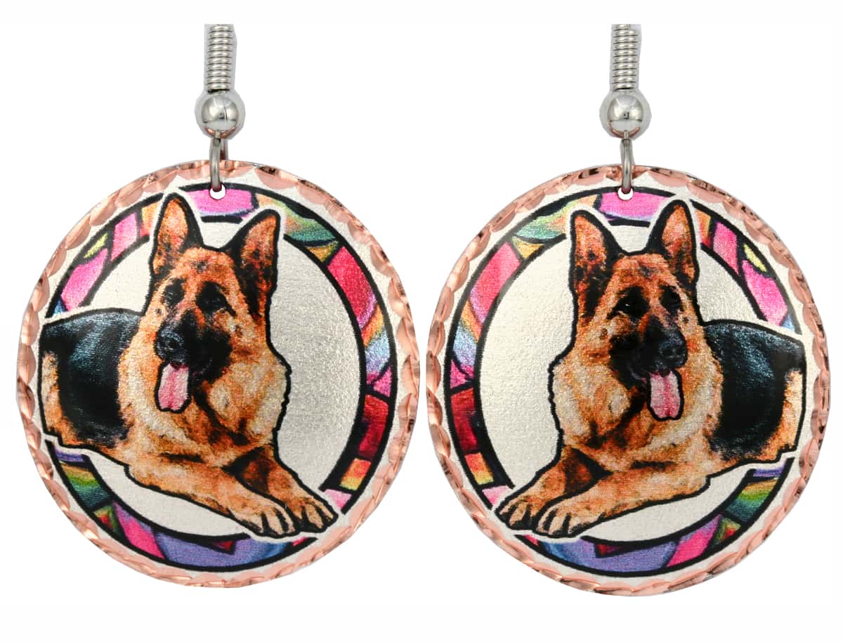 German shepherd earrings are artisan made from copper in colorful dog design with sparkling diamond cuts. Buy cute shepherd earrings for dog loving women. These pretty oval shape earrings are 26 mm X 28 mm ( about 1 inch) in size. These gorgeous dog earrings have easy-to-put on the best quality surgical steel French hook ear wires with rose gold plated ball and spring. Copper Reflections is the only handmade jewelry online shop where you can find these unique dog jewelry earrings.