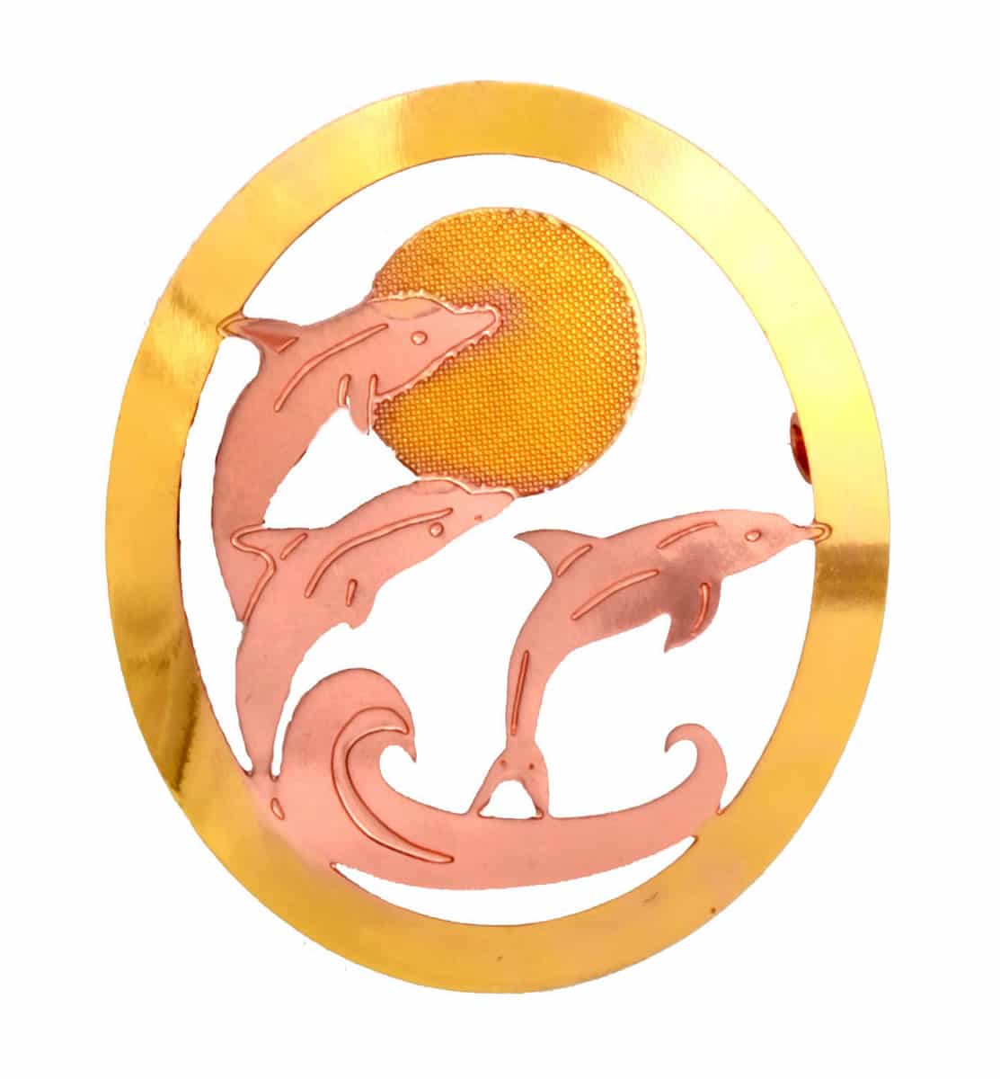 Cut out unique dolphin brooches are created in cut-out three dolphin designs. This unique dolphin brooch is two-tone copper and gold-plated protected with an acrylic finish. Copper Reflections has created the most unique handmade brooches inspired by the beauty of wildlife and animals.