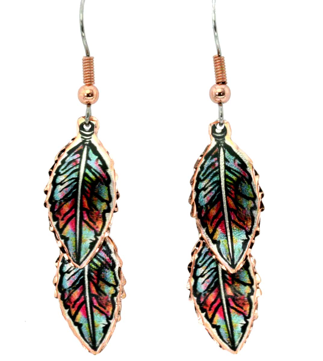 Delicate double feather copper earrings with multi-colored design. Each piece is individually handmade, silver plated and diamond cut to highlight these small copper feathers earrings.