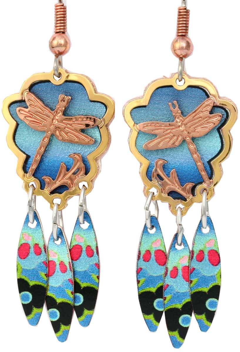 Unique handcrafted earrings are handmade in two tone gold and copper plated cut through dragonfly jewelry design with colorful copper background and dangles.