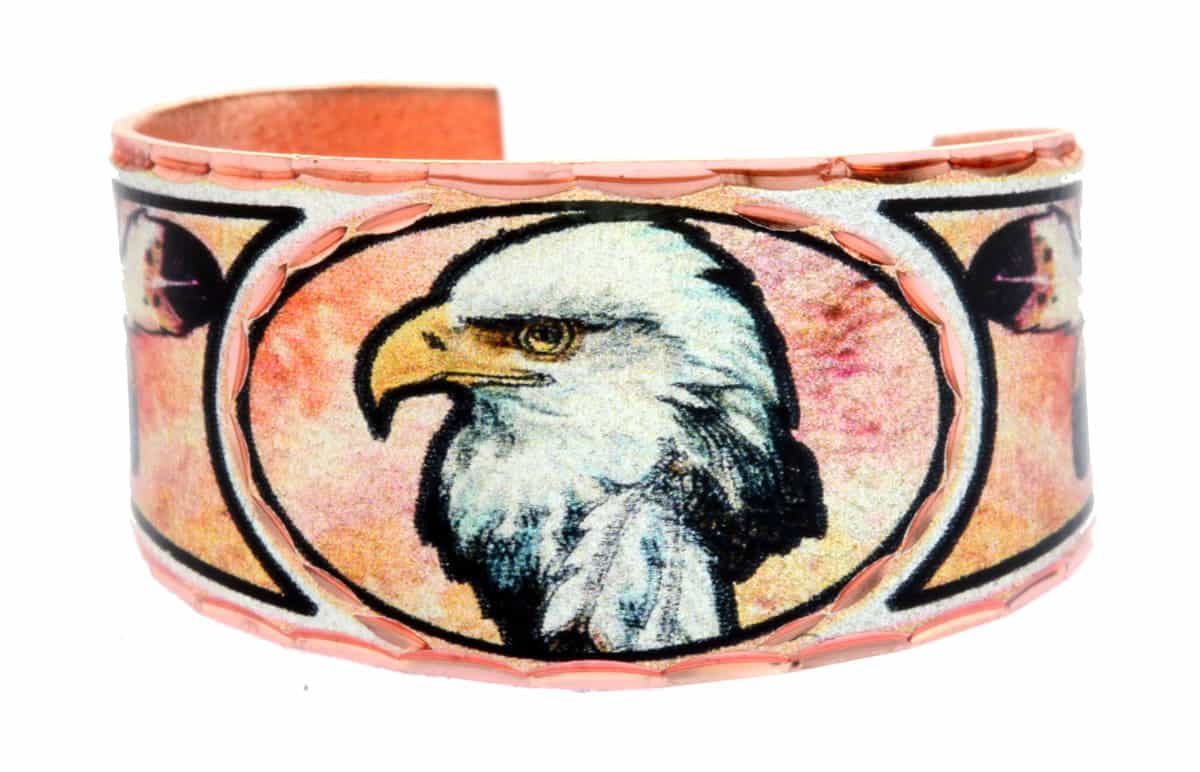 Fabulous handmade rings painted in watercolors in striking bald eagle head with eagle feathers design on the sides. Bright cut by hand all around the eagle head makes these unique rings sparkle like diamonds. The Eagle is a powerful symbol of courage, wisdom and honor. Eagle Feathers are symbols of prayers, sources of ideas and marks of honor.
