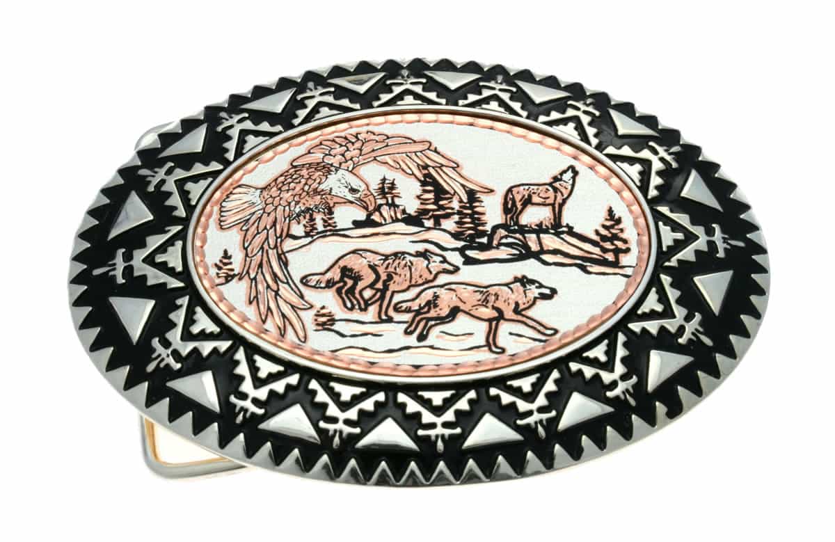 Eagle & wolf western belt buckle made from silver-plated zinc alloy with black accents decorated with amazing copper eagle & wolf design. The overall size of western belt buckles is 3 inches x 4 inches (7.8 cm x 10 cm ) and the belt holder will hold up to 1 3/4 inch (4.5 cm) wide belt. No polishing is required.