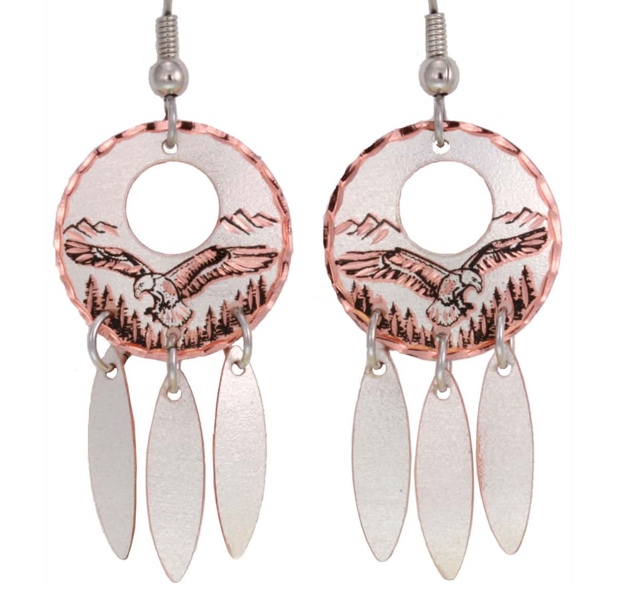 Purchase the stunning Dangle Eagle Earrings by Copper Reflections. These handmade, copper earrings are truly one-of-a-kind, allowing you to reflect your individuality and make a bold statement wherever you go. Crafted with the utmost care and attention to detail, these unique earrings showcase the finest craftsmanship quality. The ear wires are made of surgical steel hypoallergenic material, ensuring comfortable and irritation-free wear. Not only are these earrings stylish and elegant, but they also possess remarkable durability. They do not change color or tarnish over time, making them a perfect addition to your jewelry collection. And the best part? No polishing is required!