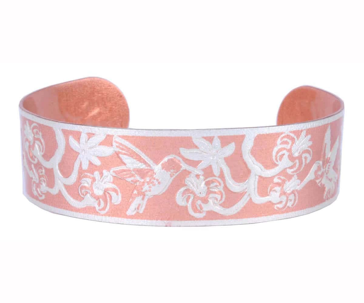 Women’s copper bracelets embossed in hummingbird design with silver, and copper tones. These fascinating unique women’s bracelets can be adjusted to the wrist. These hummingbird jewelry bracelets will make an unforgettable gift for women.