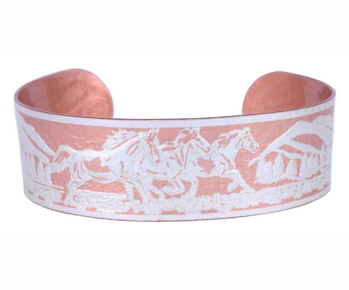 Unique bracelets embossed running horses design on this stunning mens bracelet. Copper cuff bracelets can be adjusted to the wrist. These horse bracelets will make unique gifts for men.