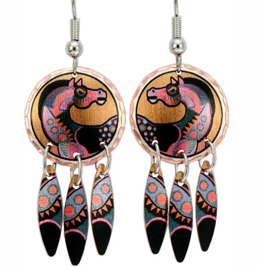 These handcrafted horse earrings are silver plated and diamond cut on copper with three dangles in this Enchanted horse artwork by Bob Coonts. These unique earrings combine bold colors, graceful movements and fine details that will make the perfect gift for horse lovers.