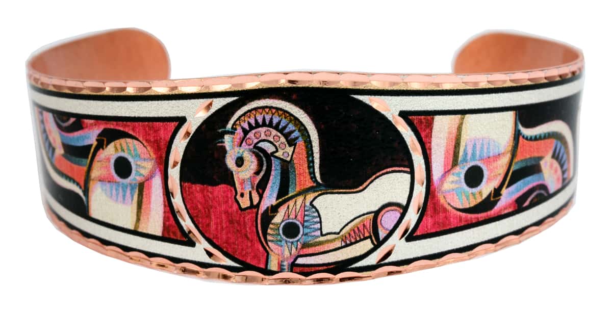 This Equus horse artwork by Bob Coonts on these handmade horse bracelets combine brilliant colors and exquisite detail to create these stunning cuff bracelets. These unique bracelets are silver plated, diamond cut on copper and coated with clear acrylic finish so no polishing is required.