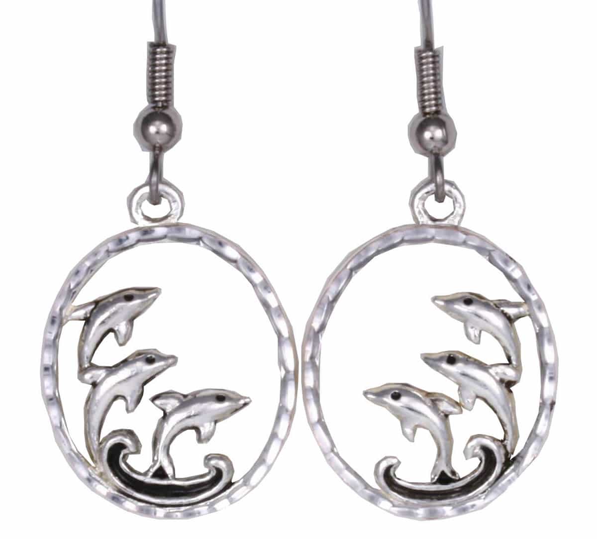 Fashion earrings created in a lovely cut-out dolphin design, antique silver plated and diamond cut to sparkle. Casual, yet stylish silver plated fashion earrings for women created of premium quality and sold at affordable prices.