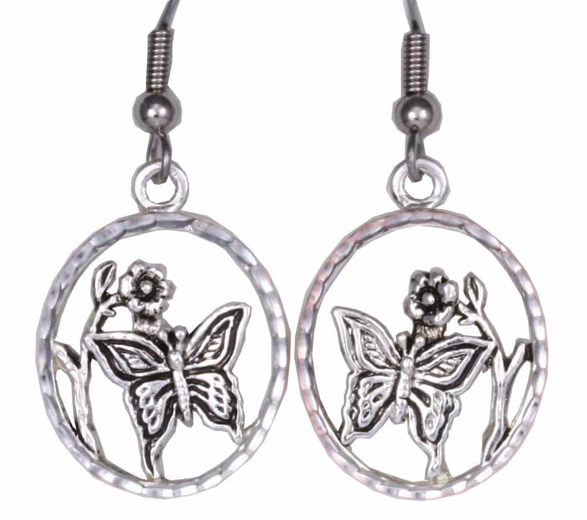 Cut out fashion butterfly earrings are created in a cut out butterfly and flower design, antique silver plated and diamond cut to sparkle. Reasonably priced for extraordinary fashionable looks.