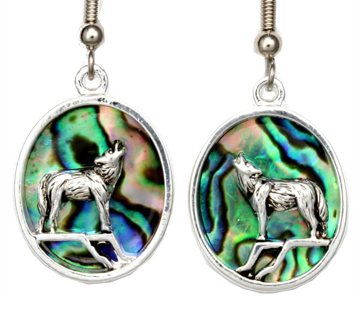 Abalone inlay silver-plated wolf earrings created in cut-out howling wolf in this pretty cast design adorned with shell. Shop fashion abalone wolf earrings that are the perfect gift for your girlfriend. Our lightweight earrings are always a pleasure to wear without the pain of heavy cast earrings. All our handmade earrings have surgical steel hypoallergenic ear wires so you can enjoy them without any discomfort.