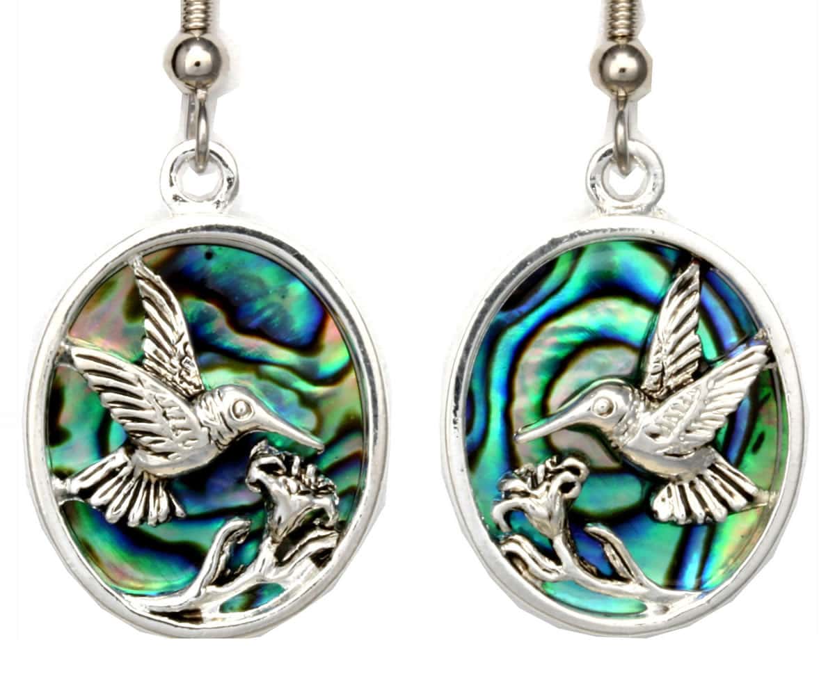Unique abalone inlay silver-plated hummingbird earrings are antique silver plated with colorful abalone shell background. If you are looking for pretty and fun-to-wear jewelry these abalone earrings are a perfect choice.
