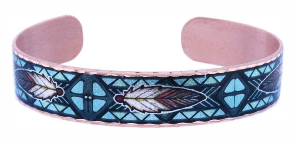 Feathers artwork Native bracelet, colorful art jewelry bracelets designed by Lynn Bean in beautiful feather design with Native American flair. Accessorize your outfits by wearing this beautiful handmade feather cuff bracelet from Copper Reflections offering the best affordable handmade jewelry online.