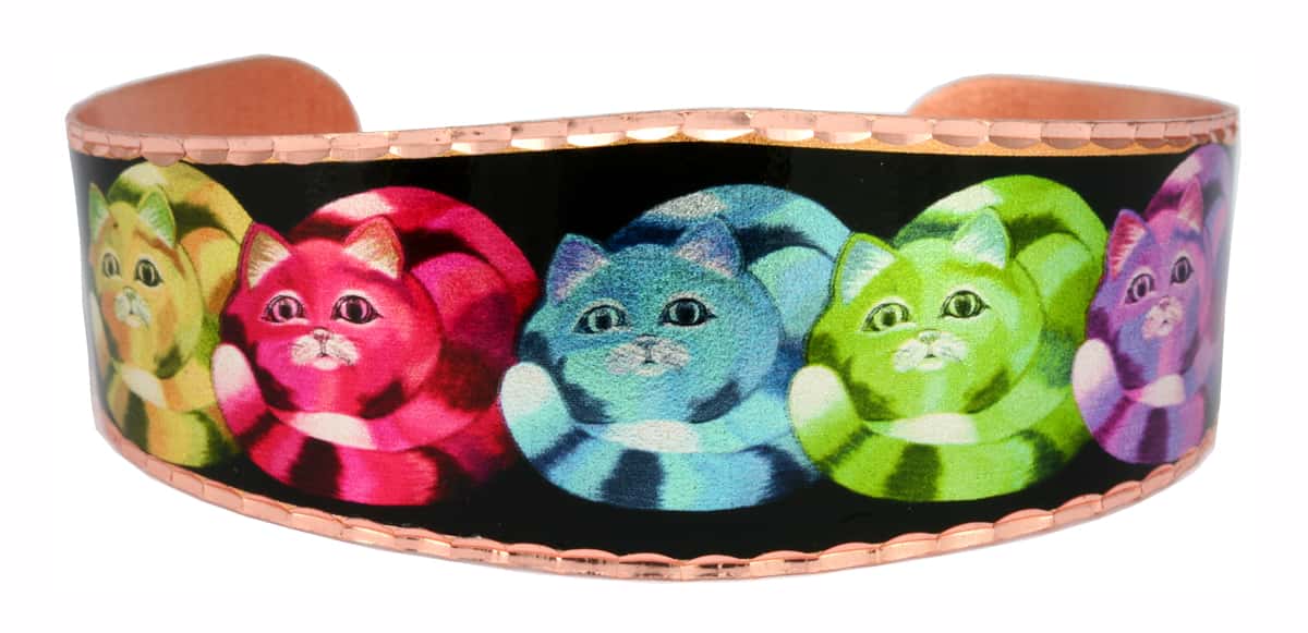 Fun and fabulous art bracelets are handcrafted by the artisans of Copper Reflections in this Five Colorful Cats artwork by Nick Gustafson. Our copper bracelets have a clear acrylic finish so no polishing is required, just wear and enjoy.