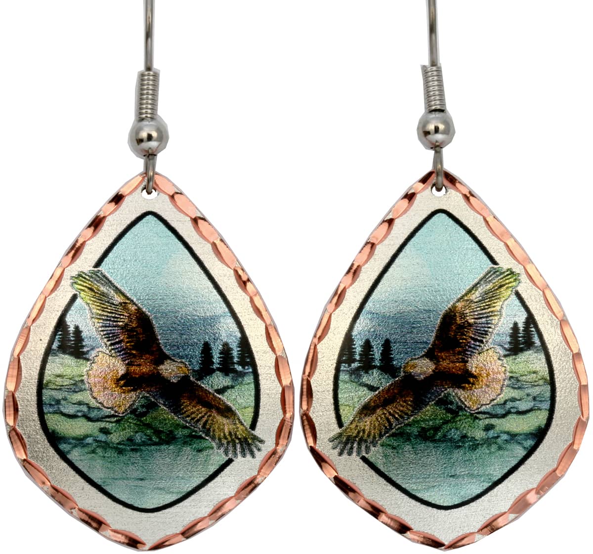 Flying bald eagle earrings made from copper in an amazing Alaska wildlife scene with lovely colors. Buy exclusive flying eagle earrings she will love and cherish. These wonderful diamond shape earrings are 25 mm x 32.8 mm ( about 0.98 x 1.3 inches ) in size. We use only high-quality components such as pure copper and the best quality surgical steel hypoallergenic ear wires so you can comfortably wear these gorgeous earrings. The majestic American Bald Eagle is a powerful symbol of freedom and courage. Native Americans believe the eagle to be the carrier of prayers, visions, and spirits.