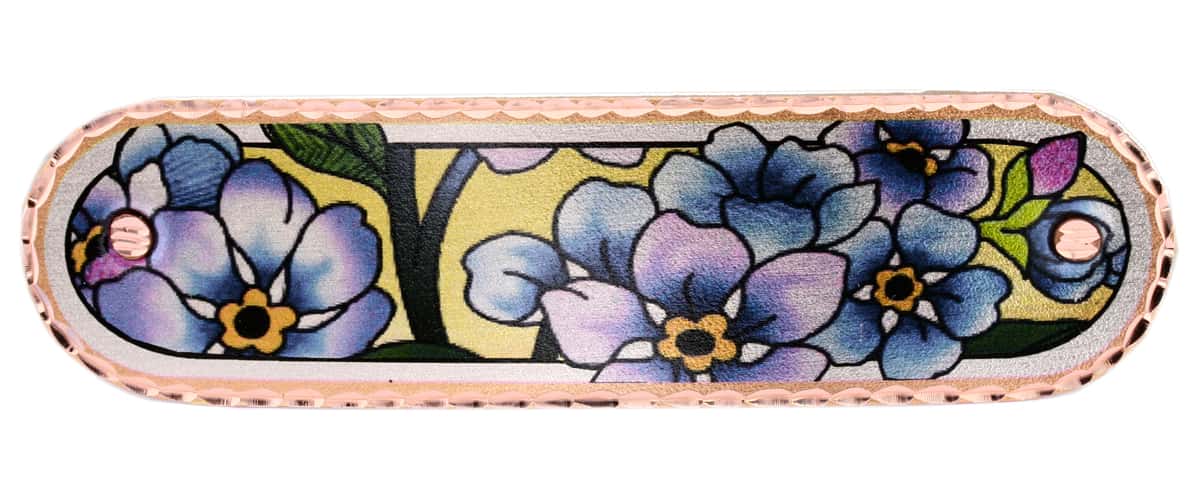 Forget me not hair clip handcrafted from copper in colorful Alaska State forget me not flower artwork. Buy rich and beautiful forget me not hair clip that will impress everyone. We use special techniques to create handmade jewelry that we have developed over the years. Hair clips are made in a rectangular shape of 22 mm x 91 mm ( about 0.87 x 3.6 inches ) in size. French barrette backings are securely riveted on the back of the copper hair clips.