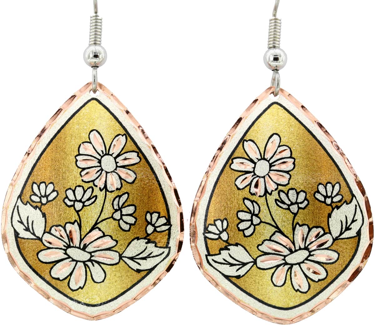 Gold colored flower earrings are made from copper in a fascinating flower design with a golden background. Be a trendsetter wearing these chic flower earrings These wonderful diamond shape earrings are 25 mm x 32.8 mm ( about 0.98 x 1.3 inches ) in size. Our handmade jewelry is nickel and lead-free so you can enjoy wearing them comfortably. as some people may have allergies to certain materials.