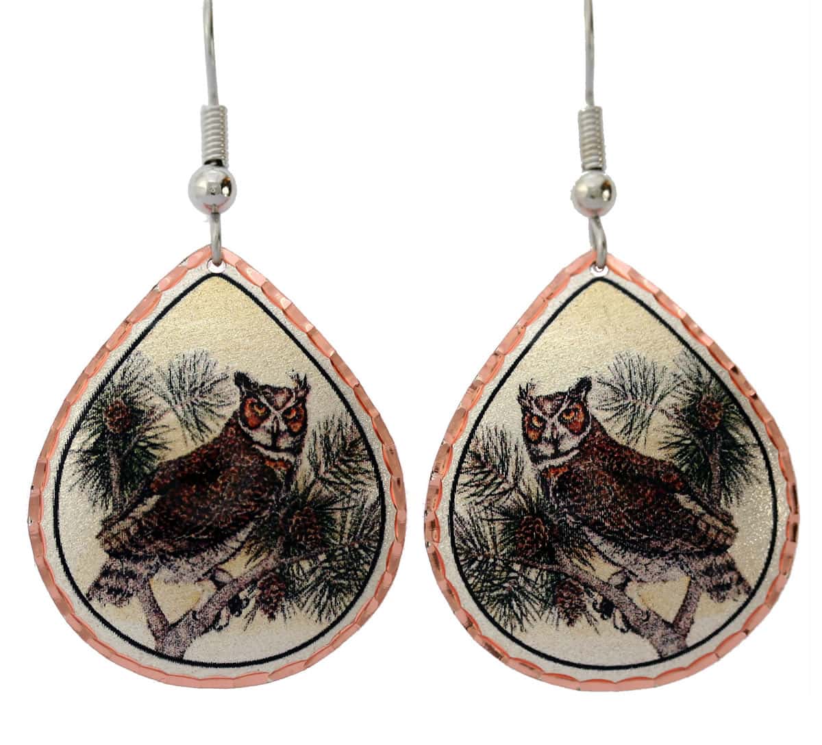 Owl earrings designed by Lynn Bean. Great horned owl earrings handcrafted on tear drop shape in intense colors. You will love the reasonable wholesale prices on our zoo animals jewelry.