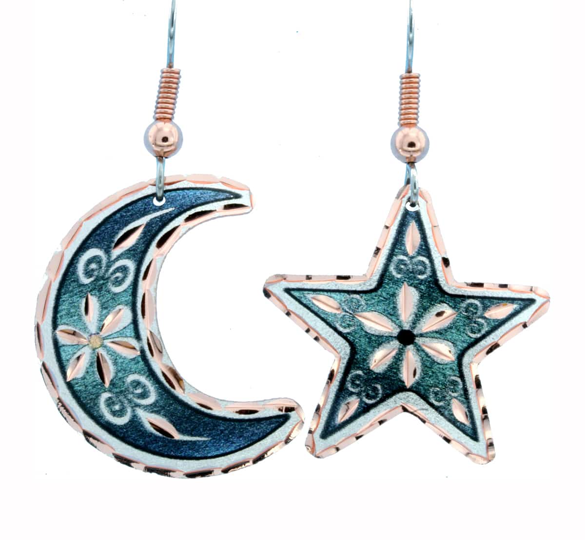 Green moon and star flower earrings are made from copper with diamond cutting to sparkle. Buy elegant & classy moon and star flower earrings that are fun to wear. Unique handmade jewelry by Copper Reflections will make a standout addition to your collection. You will love the fact that our handmade earrings are lightweight, do not change colors, and have the best quality surgical steel ear wires so they are safe to wear.