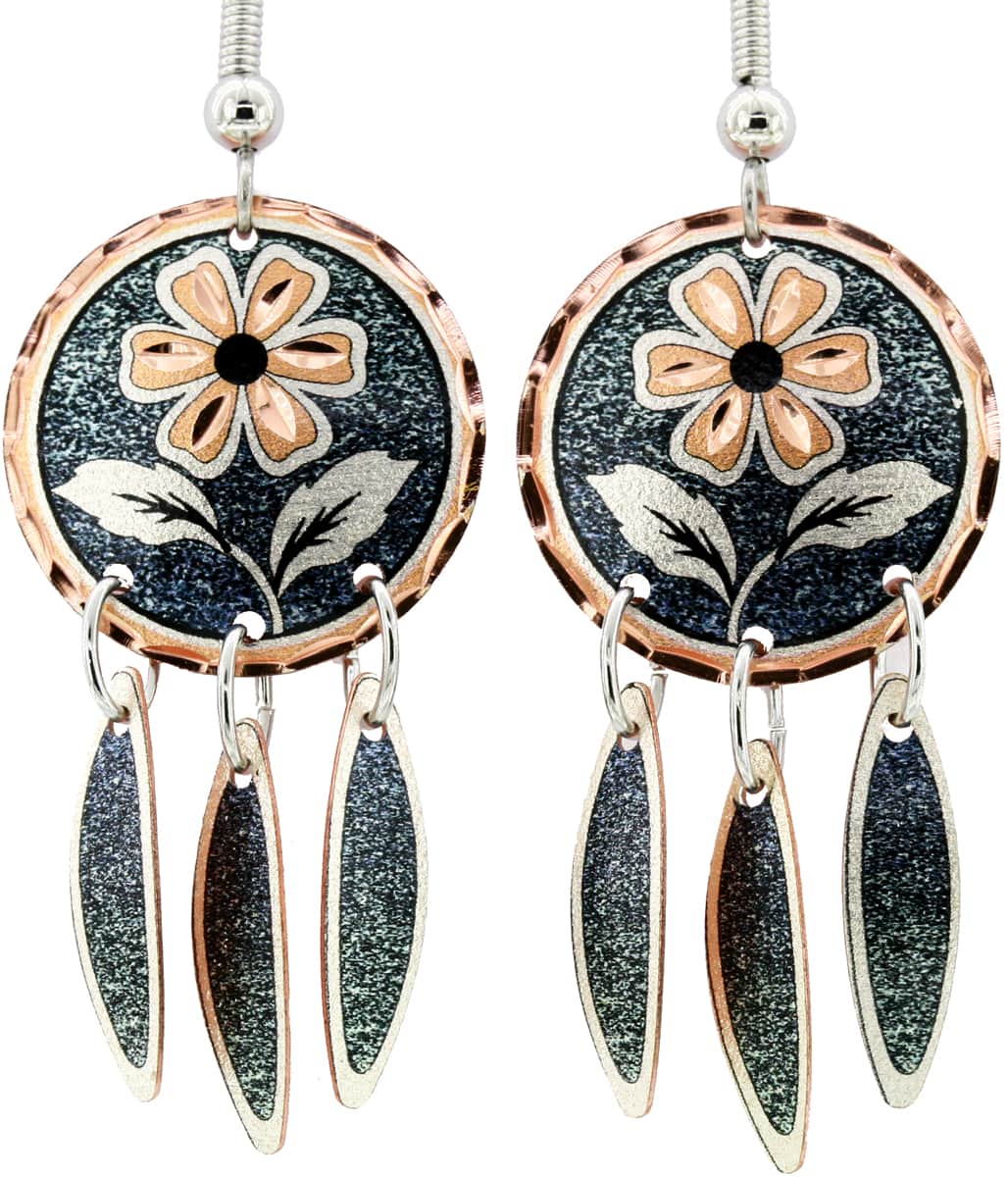 Green dangle flower earrings are made from copper in pretty flowers with dark emerald green background. Buy feminine and unique dangle flower earrings. These exclusive dangle earrings are 19 mm ( about 0.75 inches) in size in the round top part with dangle feathers. Earrings are lightweight, ear wires are the best quality surgical steel hypoallergenic so you can comfortably and safely wear them for a long time even if you have sensitive skin.These dark emerald green flower earrings will impress everyone with stunning flower design, fine detail, and superior quality craftsmanship.