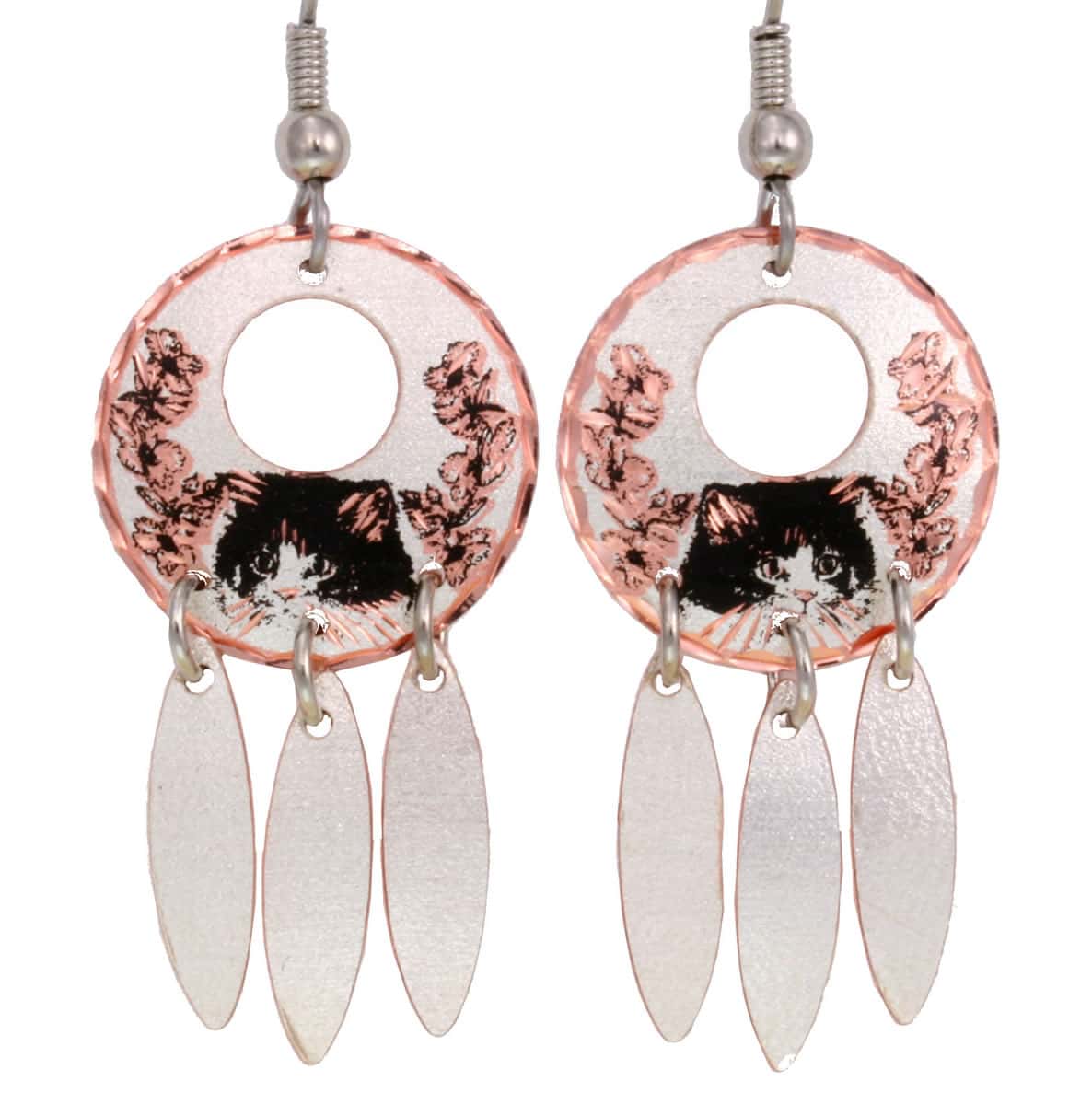 Purchase our exquisite dangle cat earrings, where craftsmanship meets elegance. Each pair is meticulously handcrafted by highly skilled artisans at Copper Reflections, ensuring a unique and stylish addition to your jewelry collection. Dangle cat earrings are highly skilled artisan-crafted from copper & diamond cut to sparkle. Buy cute cat earrings for women who love stylish and feminine looks. These exclusive dangle earrings are 19 mm ( about 0.75 inches) in size in the round top part with dangle feathers. We use only high-quality components such as pure copper and the best quality surgical steel hypoallergenic ear wires so you can comfortably wear these gorgeous earrings.