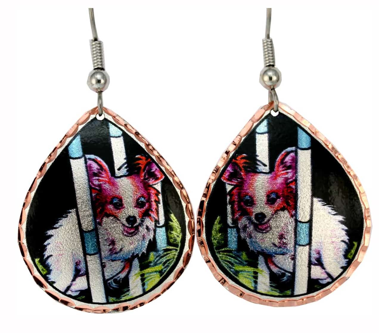 Papillon dog earrings are made from copper in colorful terrier artwork designed by Lynn Bean. Shop stylish and pretty papillon earrings for dog lovers. These awesome teardrop shape earrings are 23 mm X 27.5 mm ( about 0.90 x 1 inch) in size. All our jewelry is nickel free. Each piece of our dog jewelry has an acrylic coating to prevent tarnishing, so no polishing or special care is required. We use only the best quality surgical steel hypoallergenic ear wires so you can safely wear them. All our jewelry is nickel free.
