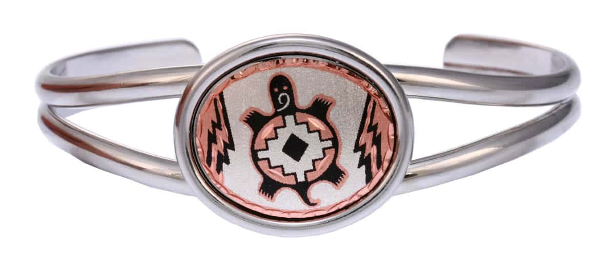Handcrafted copper bracelets are silver plated and diamond cut on this beautiful Native American jewelry Southwest turtle bracelet design. Turtle represents Mother Earth, informed decisions, planning and adaptability. Turtle has a meaning of long life. It is also a creature known to bring positive energy, good luck and long life. Celebrate long life by wearings turtle bracelets from Copper Reflections.