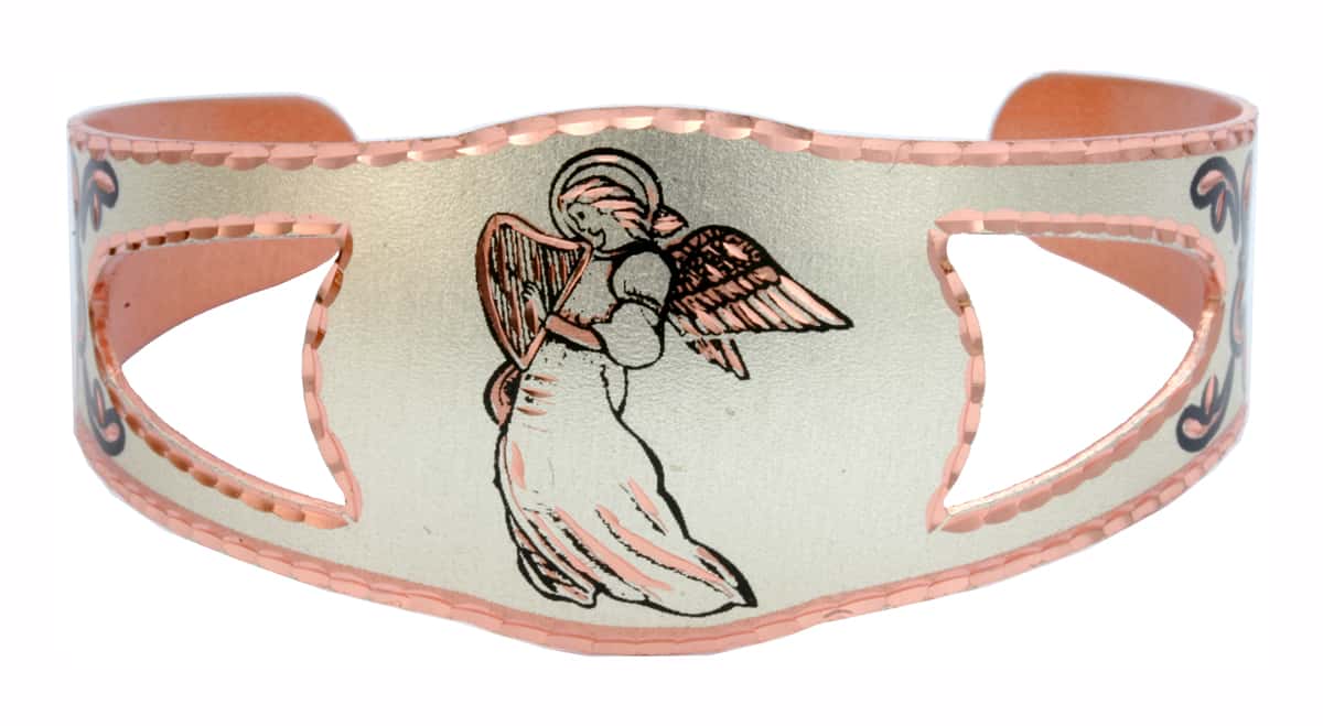 Copper angel bracelet is made from silver-plated copper in a lovely harp-playing angel design with both sides cut out. Buy a feminine and unique angle bracelet with diamond cuts by hand to sparkle for a luxurious look. Pleasingly graceful cut-out copper bracelets are about 30 mm wide in the center and about 150 mm long ( about 1.2 inches in the center and 6 inches long ).