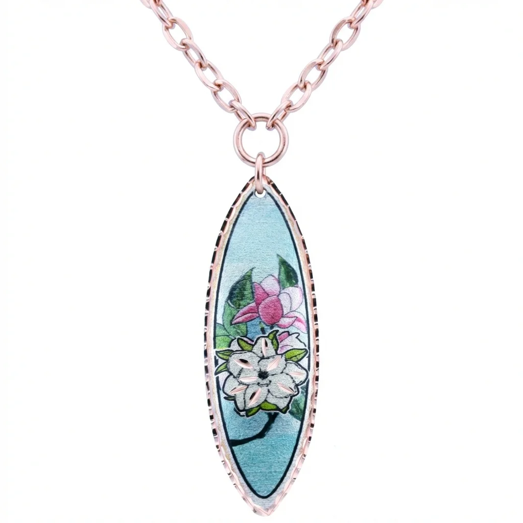 Handmade from copper and beautifully silver-plated, this majestic magnolia flower is brought to life with colorful, translucent artwork. Skilled artisans use exquisite diamond-cut techniques to make the pendant sparkle, catching the light and giving it a luxurious, high-end look. It is paired with a beautiful 20-inch-long copper-tone chain. Best of all, no polishing is required! Our pendants are protected by multiple layers of an acrylic finish, ensuring your exquisite piece remains flawless.