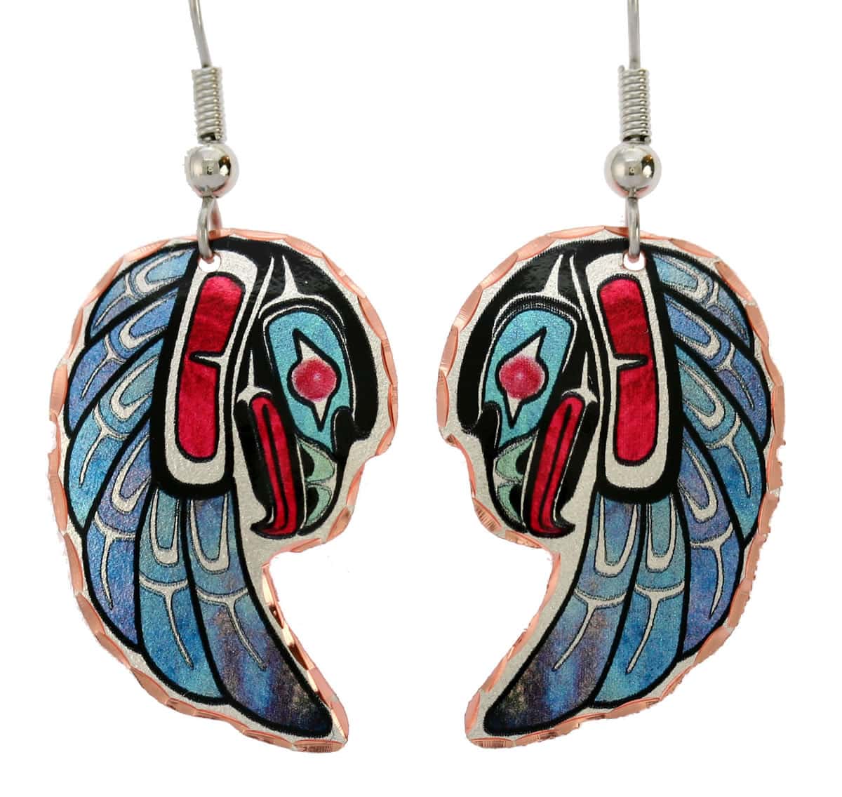 Colorful wings highlight these Native West Coast totemic eagle earrings. The unique earring shape combined with the vibrant colors make these unforgettable.
