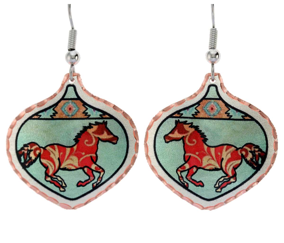 Painted pony earrings hand made with a patina green background and painted pony horse design. These distinctive horse earrings have a Southwest Native flair. If you are looking for a special gift for your horse lovers friends to show them how much you care, These beautiful horse earrings could be the one what you need.