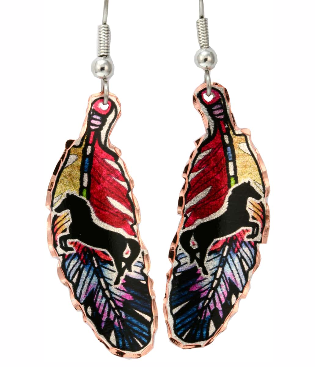These colorful copper feather earrings with dramatic horse silhouette design are handcrafted by the skilled artisans of Copper Reflections. Our handmade earrings are lightweight and comfortable to wear. An outstanding gift for any one who loves horses.
