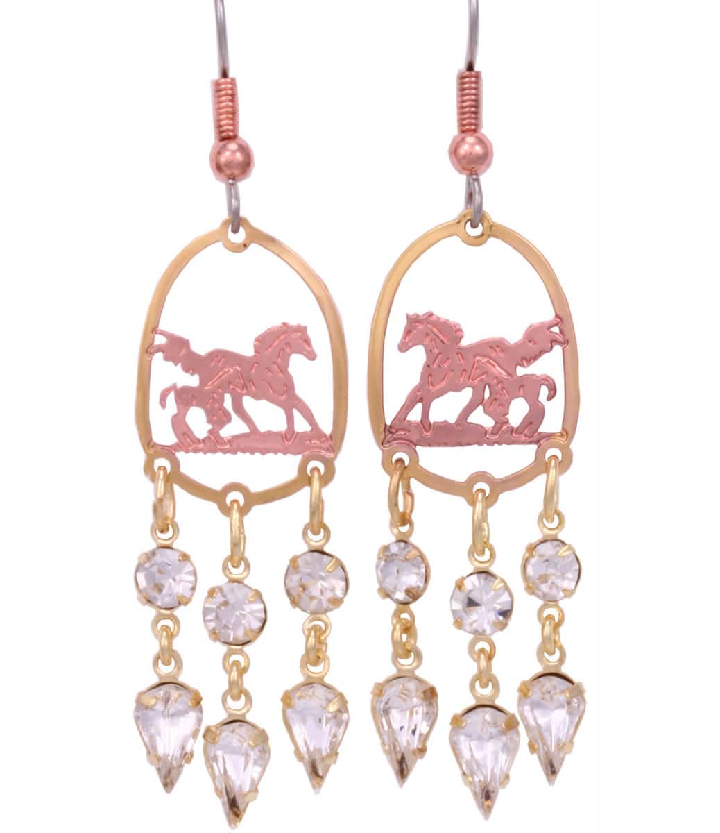 Chandelier horse earrings are made from etched copper with a golden border and dangling Austrian crystals inset into dainty bezels. Buy dangle horse earrings that are lightweight and always a pleasure to wear without the pain of heavy cast earrings. All our handmade earrings have surgical steel hypoallergenic ear wires so you can enjoy them without any discomfort.