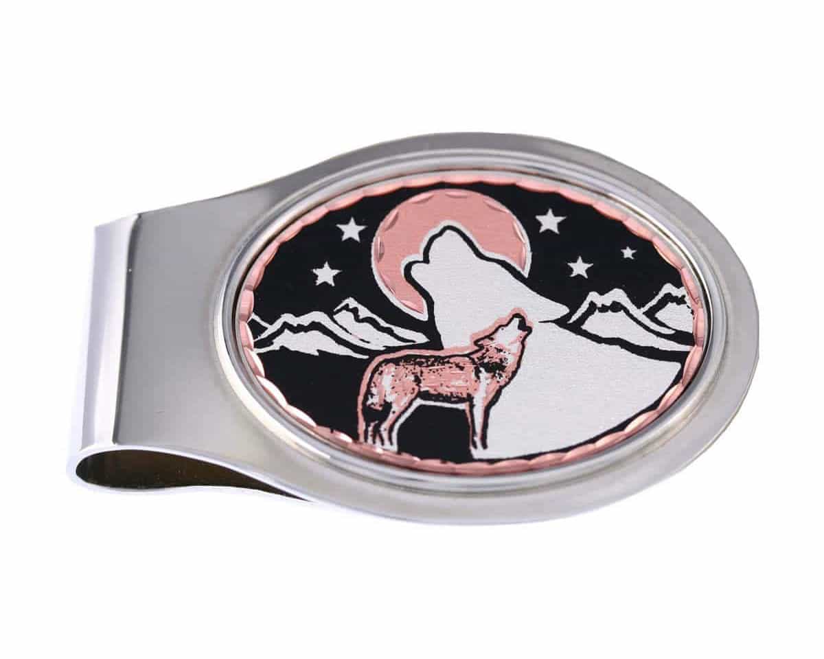 These unique oval money clips have silver plated and diamond cut copper artwork inlays in this gorgeous howling wolves and moon scene. Native Americans believe that the Wolf is a teacher and pathfinder to find new ideas and teach them to the tribe. He imparts a sense of family and loyalty. The Moon is the power ally which helps the wolf. The wolf is the voice of wilderness to access the subconscious that has the secrets of knowledge and wisdom.