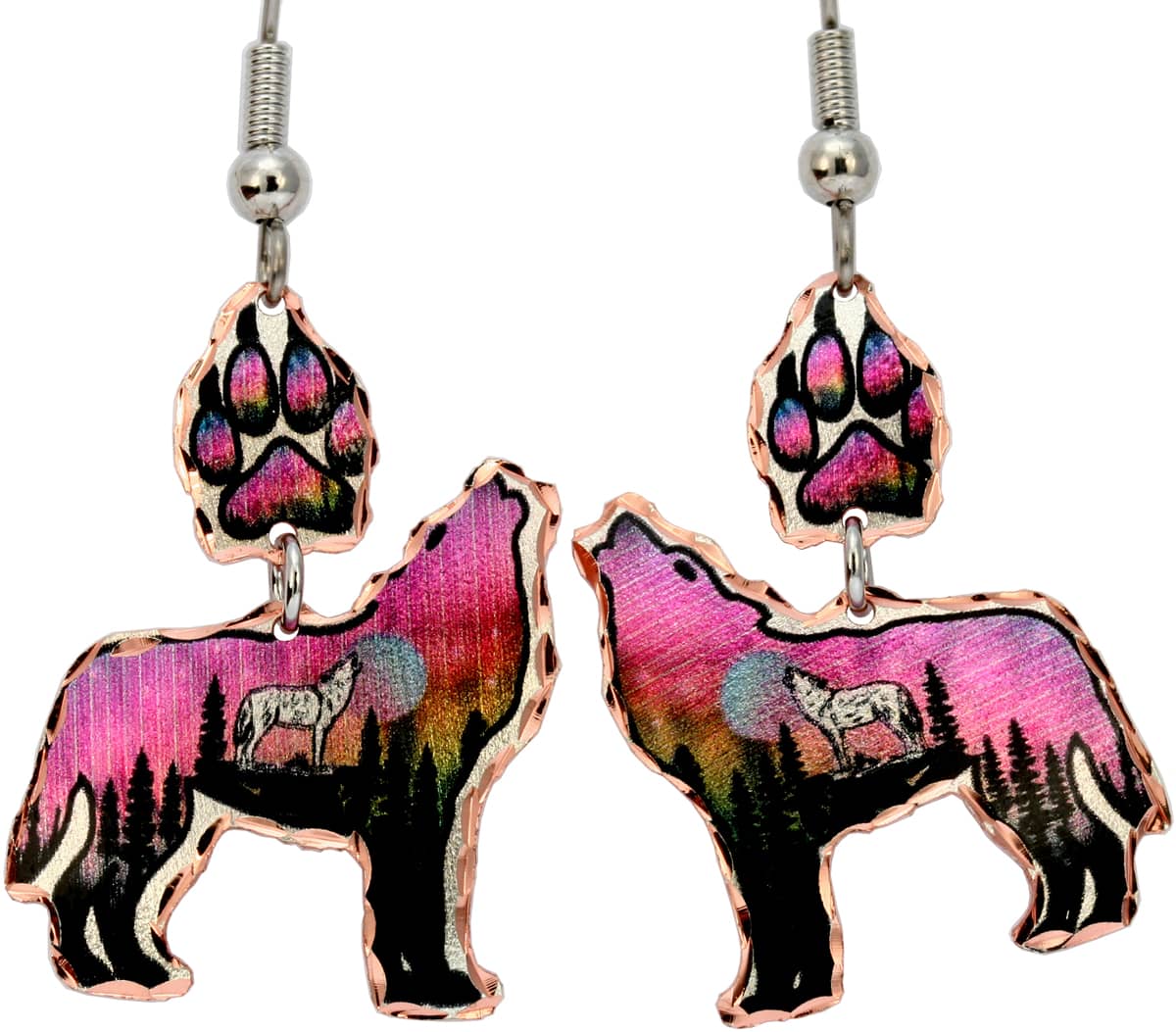 Dangle howling wolf and paws earrings are made from copper in cut-out wolf shape and paw with a wildlife Alaska scene. Buy unique dangle wolf earrings that are going to impress you with style and artwork. Earrings are lightweight unlike heavy cast earrings so you can wear them the whole day without hurting your ears. In Native Northwest culture, the wolf spirit represents successful hunting as well as the ability to work together for the common good of the group. Wolf paws are associated with authority, guidance, and leadership.
